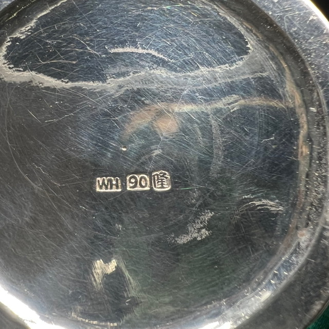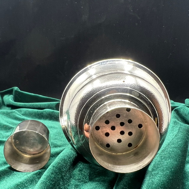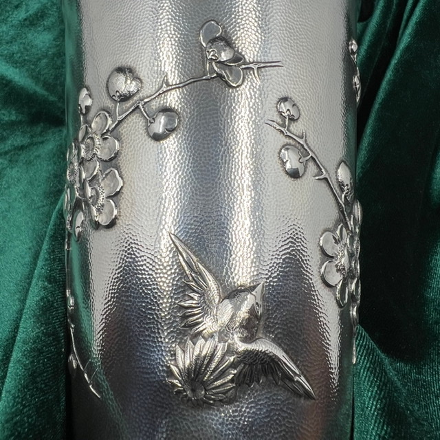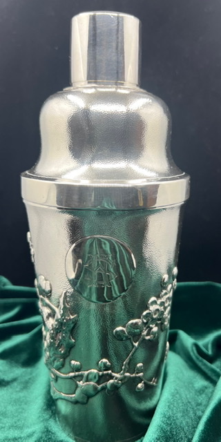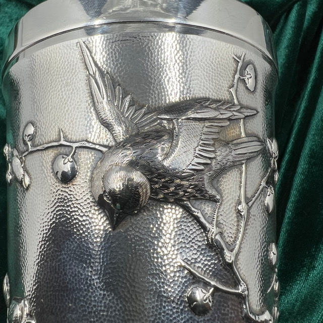 A truly spectacular hand chased Chinese export silver cocktail shaker. Hallmarked for Wang Hing circa 1900. The shaker has been deep chased with a tree trunk and trailing branches of prunus flowers that encircle the shaker. Perched in a branch is a magnificently detailed sparrow with open wings and another one in flight, Monogramed in the cartouche are the initials H.S. and the background has been hand stippled giving the effect of orange peel. The shaker is in pristine condition with out any visible dents or scratches.