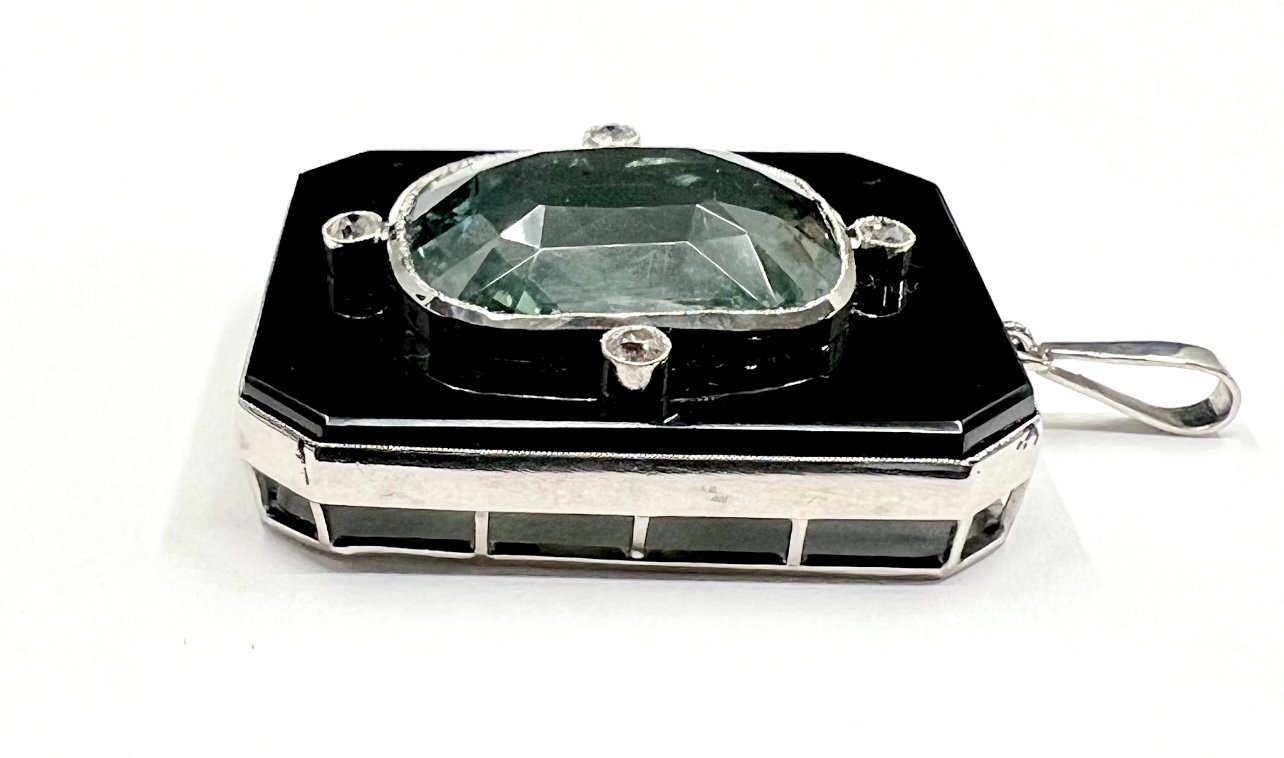 With it’s impressive twenty three carat cushion cut Aquamarine as its focal point, enhanced with in its black onyx surround and four small old mine cut diamonds this pendant is quite unique. Very few pieces of Art Deco Jewellry used this colour combination especially with the Greenish blue hue of the aquamarine and its impressive size. Mostly seen in the Art Deco Jewellry period was the combination of Diamond and black onyx.