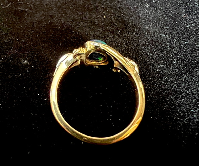 Spectacular colour with red, green and blue flashes in this Pear shaped opal. Designed to get the best show of colour, i set it at a angle across the finger with in a split twisted shank terminating in beads and scrolls. Set in the leaf shaped shoulders of white gold are there diamonds pave’ set per side.
