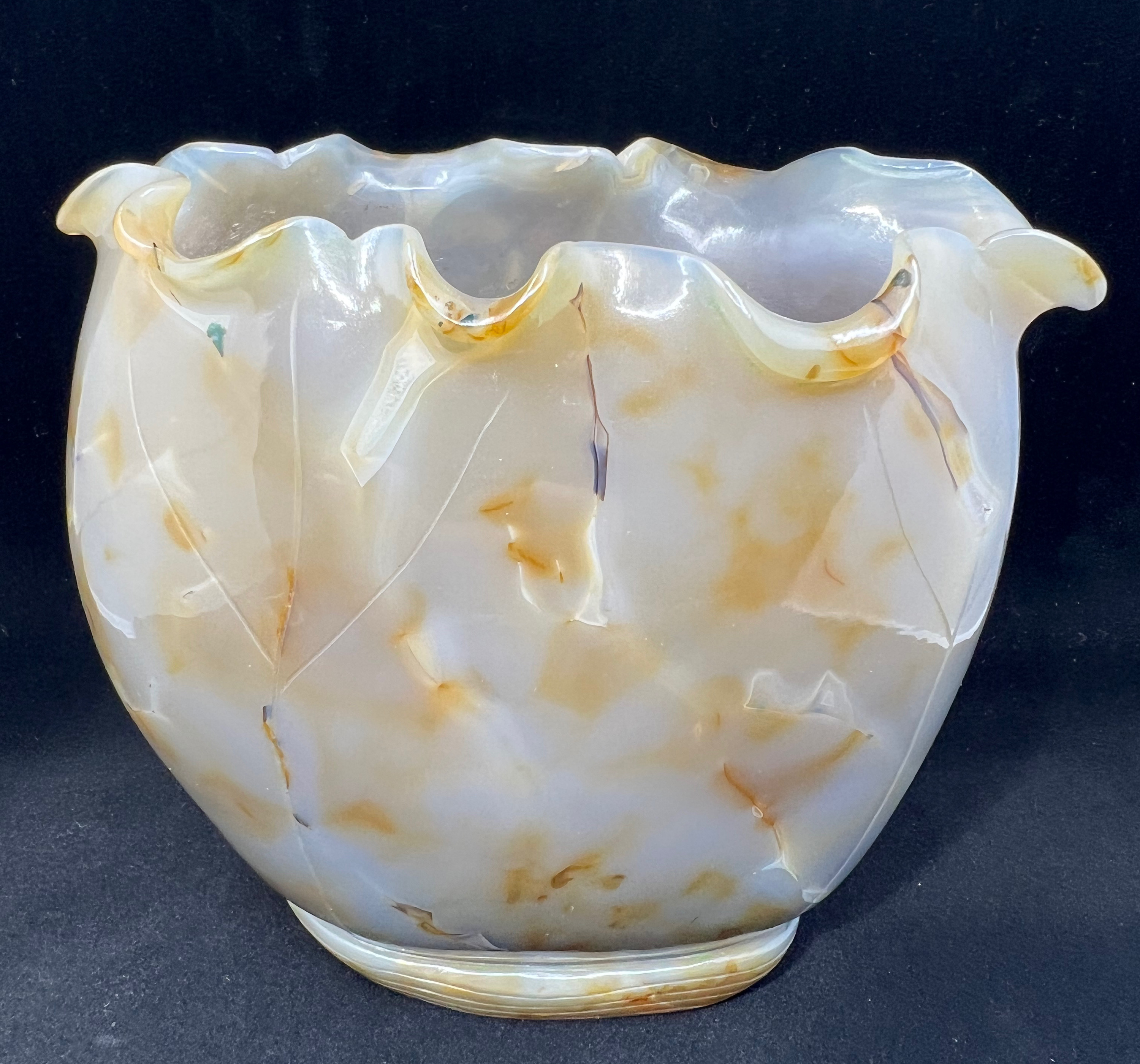 Beautifully carved with a fisherman standing on a lotus leaf catching carp. The detail and depth of carving on hard stone agate is incredible, the lotus pod stands proud of the vase and the depth of carving is approximately 12mm.( photos form part of the description). Condition is good, no nicks or breakages to the pot.