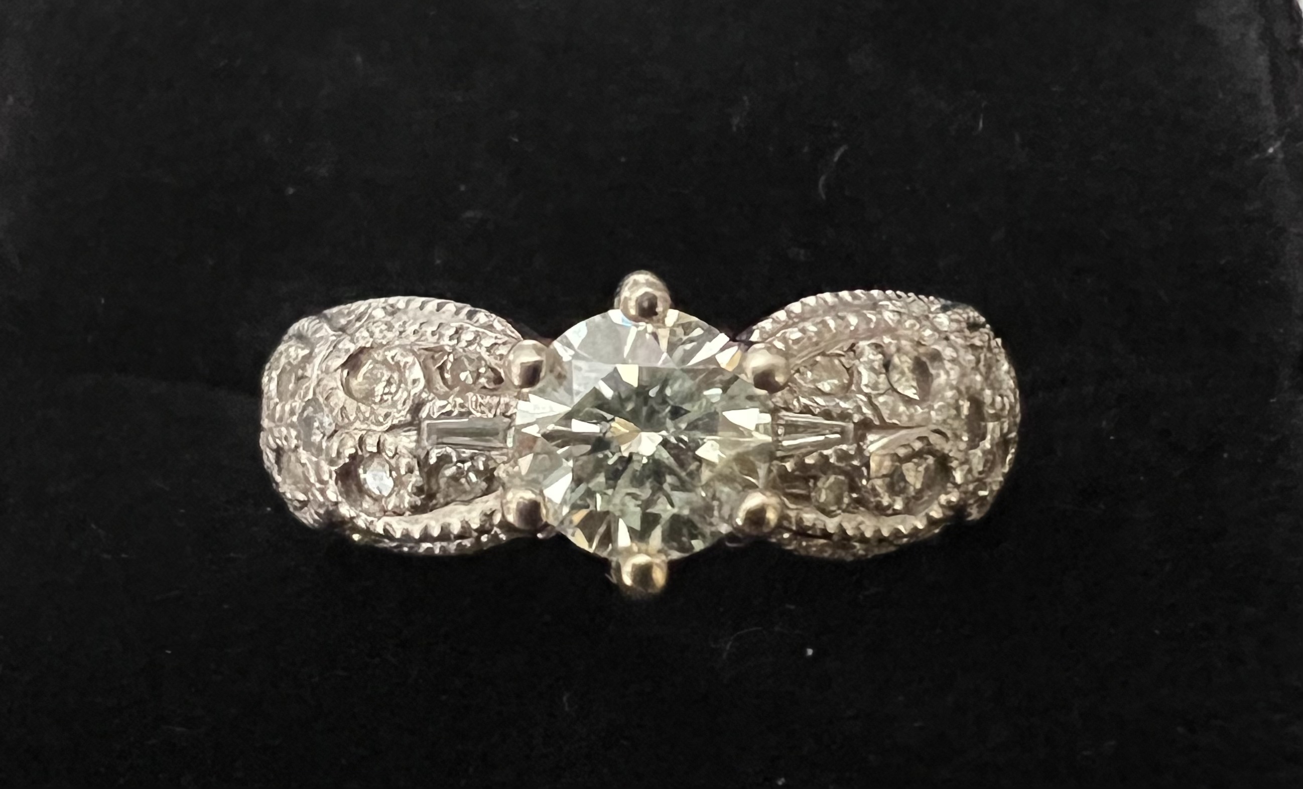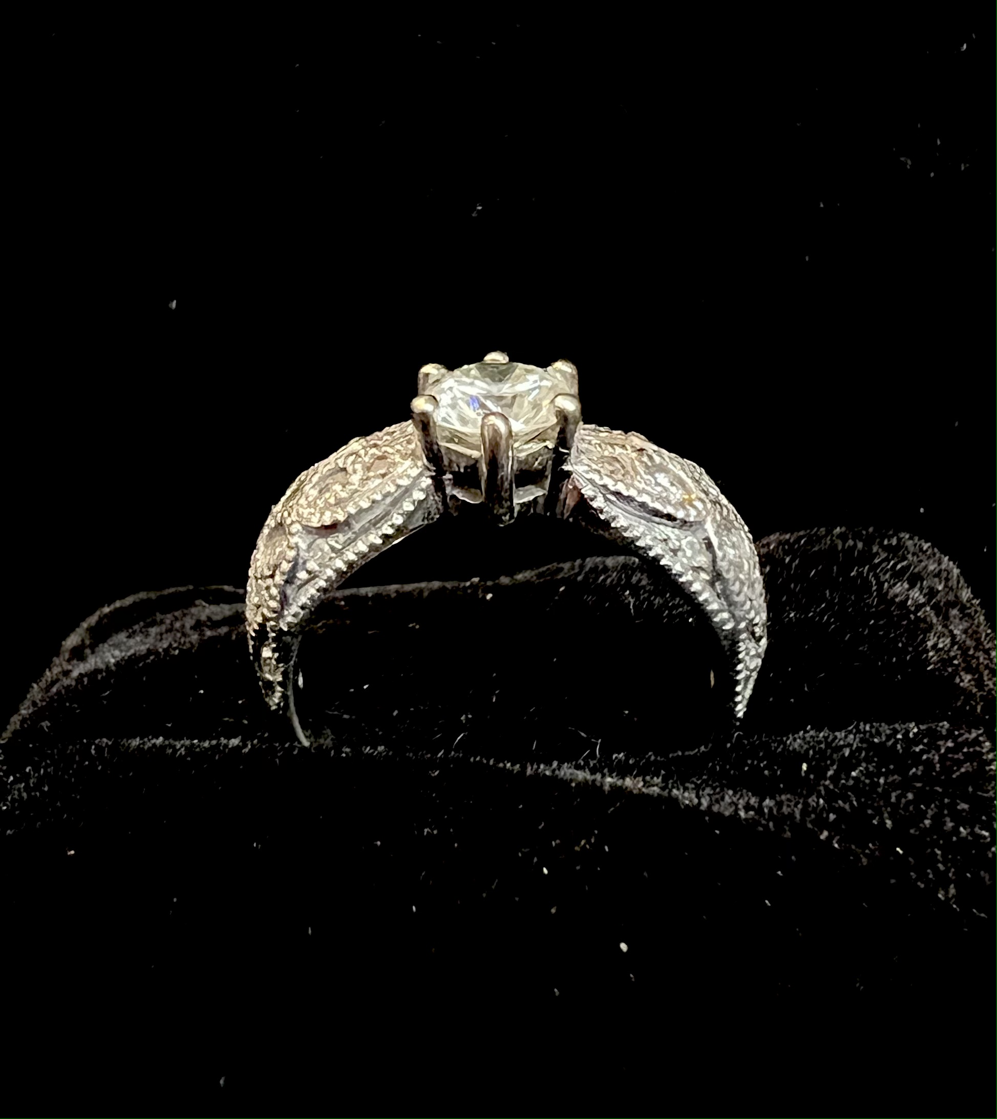 Designer made engagement ring with a twist from the past.Set with in a six claw prong/claw setting is a natural round brilliant diamond.Mill grain finished and diamond set - 18 carat white gold bulge shaped band resembles the detail found on antique silver marcasite jewellery.( photos form part of the description)