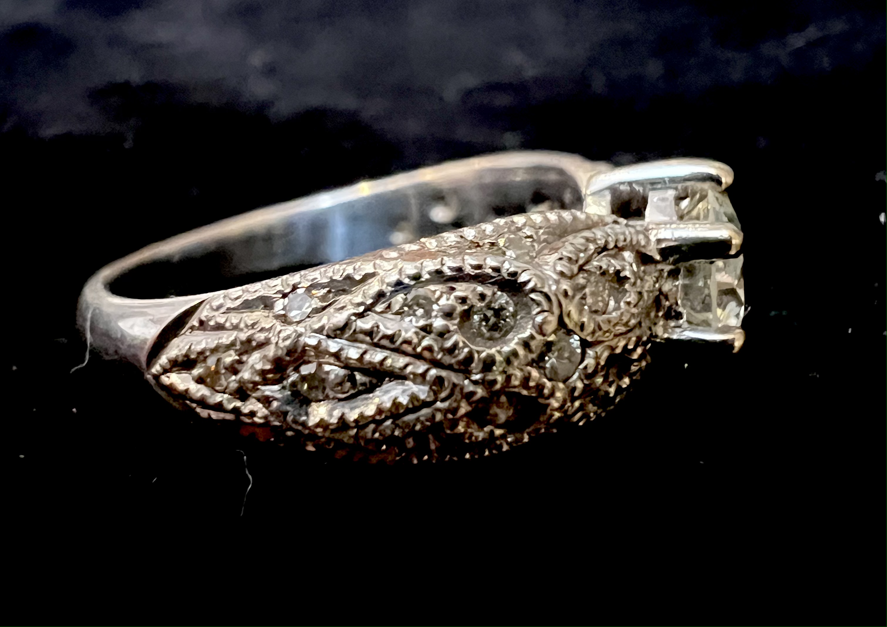 Diamonds: 32 small diamonds including two tapered baguette cut diamond-