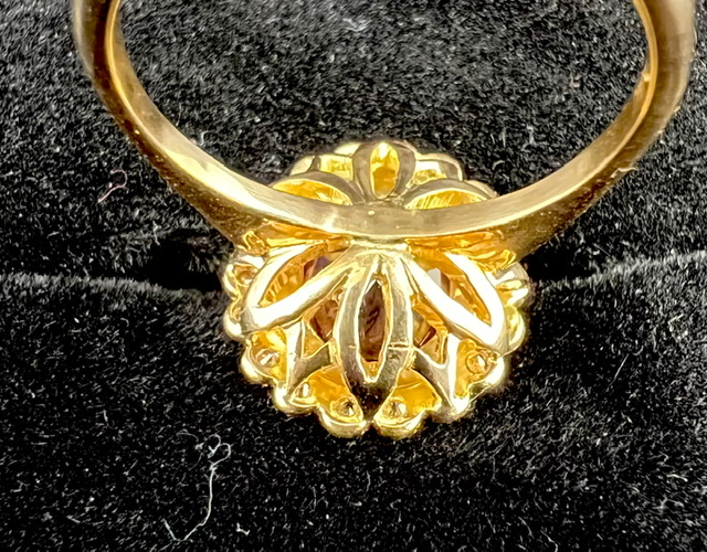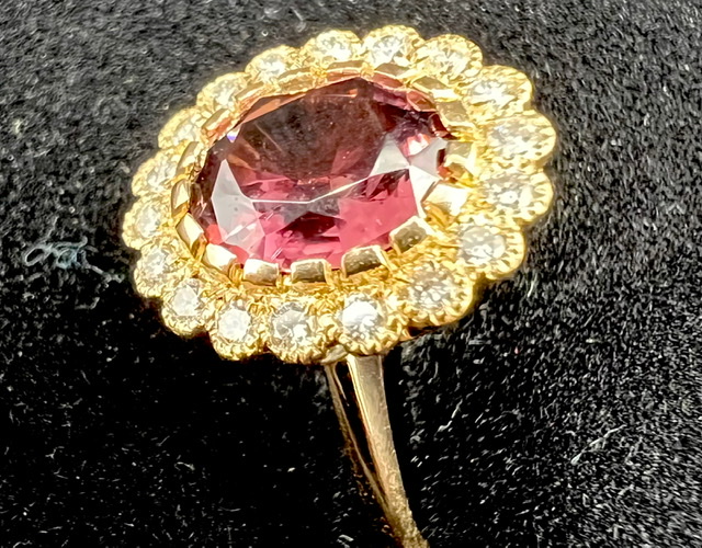 Custom designed dusty rose pink Tourmaline and diamond dress ring. Hand made with out using sharp prongs/claws, this ring is a all season North American ring. Set with numerous half circle plate like claws that lay flat on the stones girdle holding the tourmaline in place. Around the tourmaline are eighteen round brilliant cut diamonds bezel and bead set diamonds. The gallery has been hand pierced in a oval concave shape that fits below the settings.Slight knife edge shank that attaches and holds the mount.( Photos form part of the description)