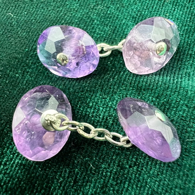 A pair of Edwardian double sided faceted oval cufflinks. Each cufflink comprising of two oval ( double-sided ) amethyst ovals drilled through and attached by oval link sterling silver chain.
