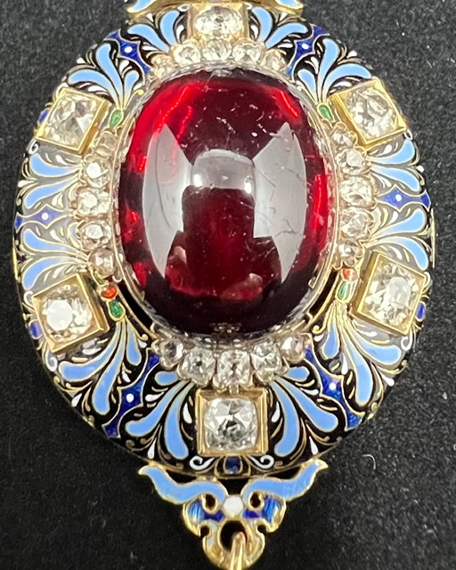 Exceptional Holbeinesque Victorian pendant set with a 23.65 carat red cabochon spinel.