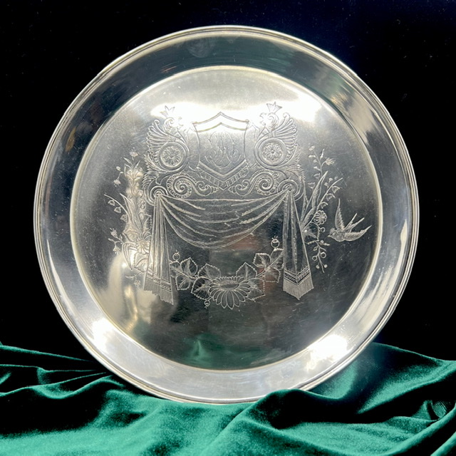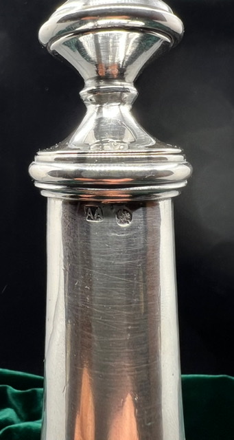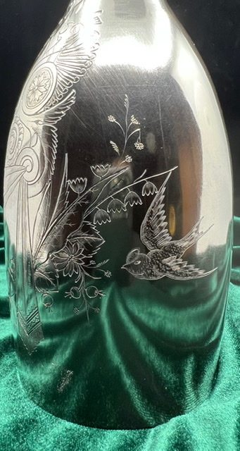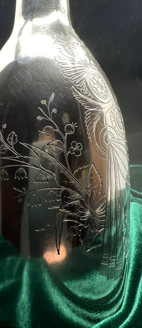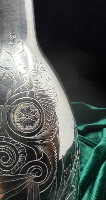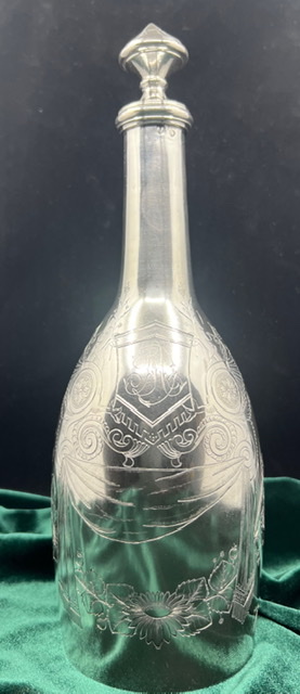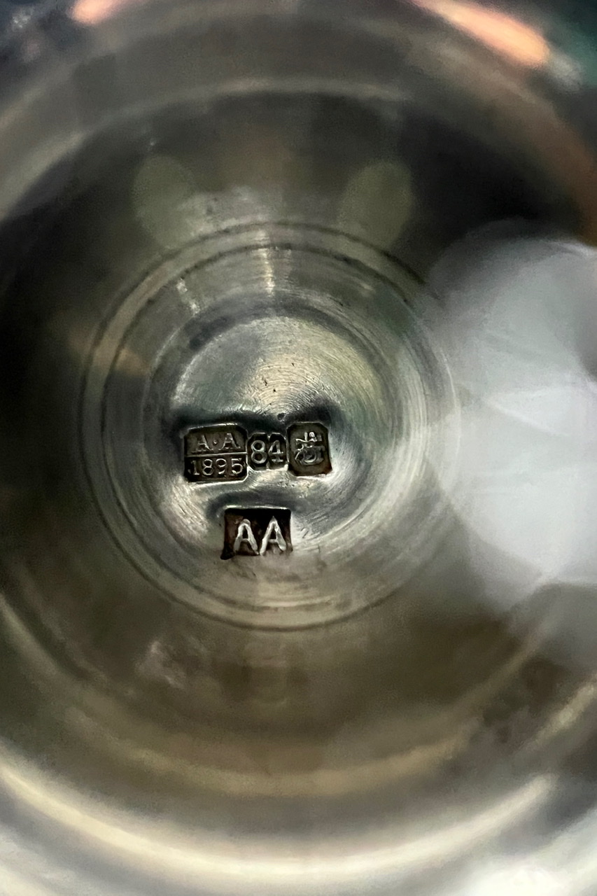 A fine imperial Russian silver vodka set comprising of a decanter, six beakers and a tray. Made in Moscow in 1895 by silversmith Andreì Andreev Aleksandrov, and assayer Anatoliì Apollonovich Artsibashev.( All the pieces are Hallmarked with matching marks and dates). Beautifully engraved in the Russian Art Nouveau style and monogrammed with A,D in script on all the pieces Garlands of lilly of the valley, berries ,leaves and birds adorn each piece( See photos they form part of the description.)