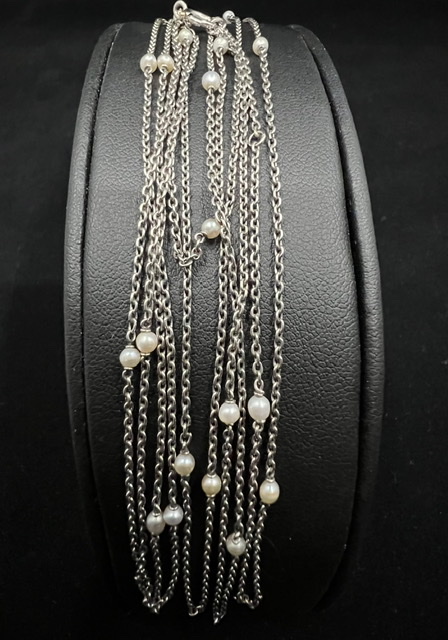 Rare French platinum and natural pearl 52 inch muff chain, circa 1800’s.