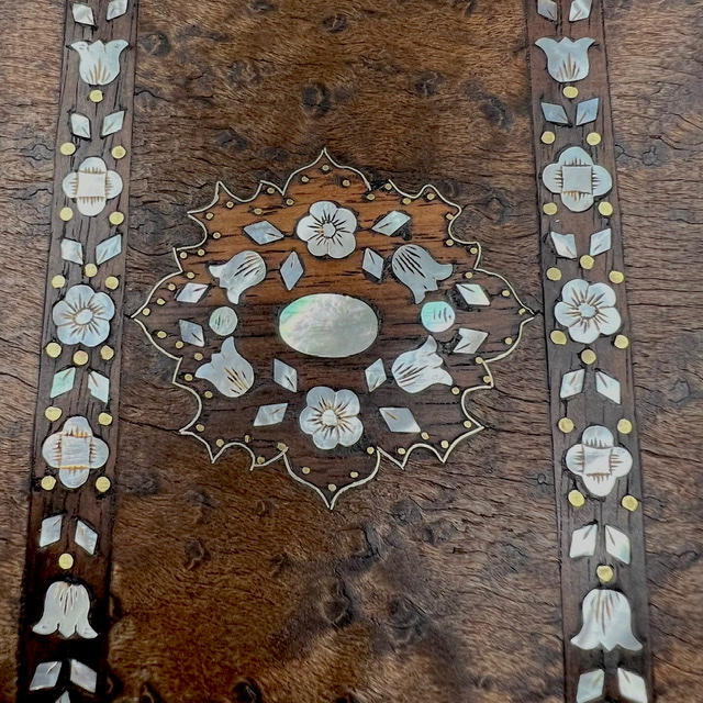 The front has a inlayed mother of pearl key escutcheon with a bell shaped border of matching materials.