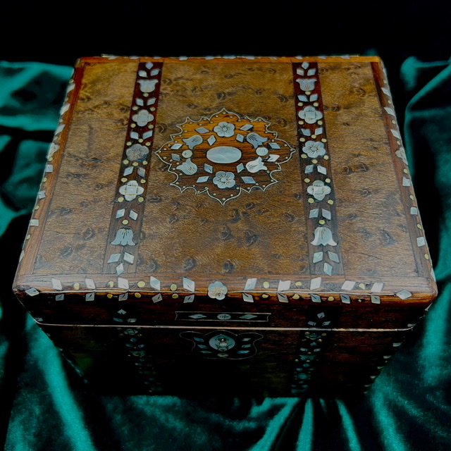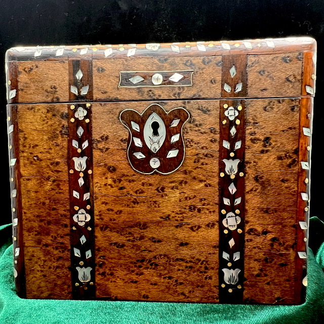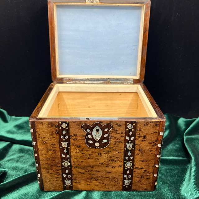 This handsome tea caddy has been inlayed with mother of pearl leaves and flowers with in bands of mahogany and embellished with brass and silver wire work.