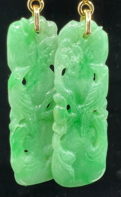 Antique pair of carved jade panels depicting a bird and peony amongst foliage. Found loose in a old box of jewellery I recreated a classic design of diamond clusters and turquoise to compliment the jade panels. Turquoise and jade is a unusual colour combination but strikingly beautiful.( Meaning on the jade panels-The peony is a symbol of wealth and prosperity and considered to be one of the most beautiful flowers in China, and the Oriole bird represents joy and friendship when depicted in pictures.)